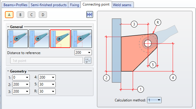 These settings are defined separately for each gusset plate by clicking on the corresponding letter symbol and then making the desired settings. By clicking on the symbol you can also use the same parameters for all gusset plates.