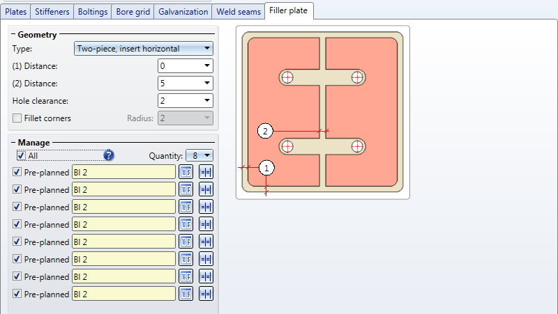 If filler plates shall be inserted on the front plate between the front plate and the tension plate, you can determine the quantity, type and size in the Filler plate tab.
