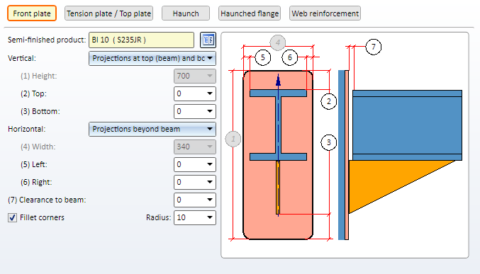 The definition of the tension plate /top plate (at the column) essentially happens analogous to the definition of the front plate at the girder. Moreover, via Type of insertion you can decide whether the plate should be inserted (top plate), front-mounted /tension plate) or not be fitted.
