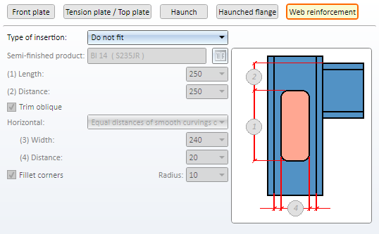 Here you can define the parameter for web reinforcement. Under Type of insertion you can select whether the web reinforcement should be fitted on the left, on the right, double-sided or not at all.