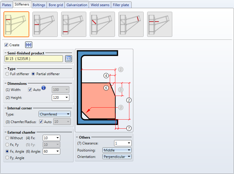 If a stiffener is to be inserted, firstly activate the Create checkbox and select the type of stiffener from the catalogue by clicking on the
