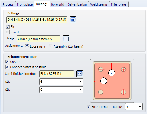If you want to insert reinforcement plates, activate the Create checkbox. If you want to connect the plates (if possible), activate the Connect plates if possible checkbox. Corners of connected reinforcement plates can also be filleted if desired: Activate the Fillet corners checkbox and enter the fillet radius.