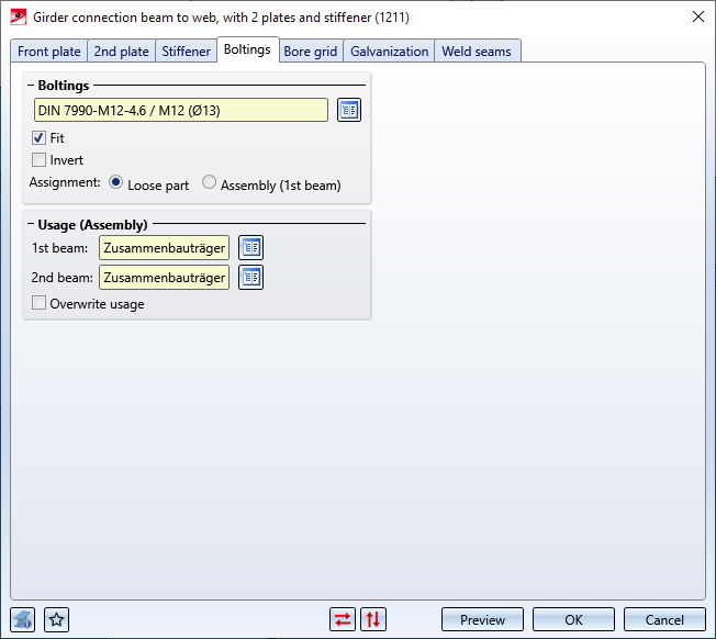 The bolting is inserted as a Bolting group. Next to Assignment you can specify whether this Bolting is to be assigned to the assembly of the 1st beam or whether it is to be inserted as a "Loose part". If you choose the "Loose part" option, the Bolting group will be inserted as a separate assembly on the same level as the assembly of the 1st beam.