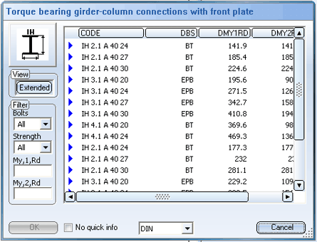 Click the Extended button to display further data of possible connections. If required, set one or several filters, such as Bolts, Strengths, etc. to restrict the selection criteria. Select the required connection and exit the window with OK.