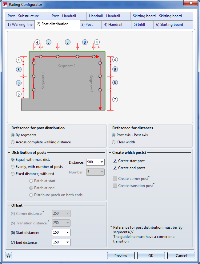 Press the middle mouse button to end identification of beams, which automatically opens the Railing Configurator dialogue window. The operation of the dialogue window is largely identical to that of the Railing Configurator (along beams) function, the only difference being the explanatory graphics in the Walking line and the Post distribution tab.