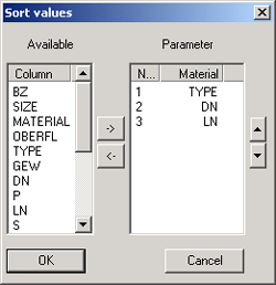 The sorting sequence can be altered with the and keys. If a table includes the column TYPE, respectively MATERIAL, this column will automatically take the first place among the sorting criteria.