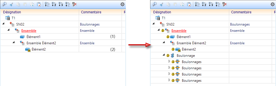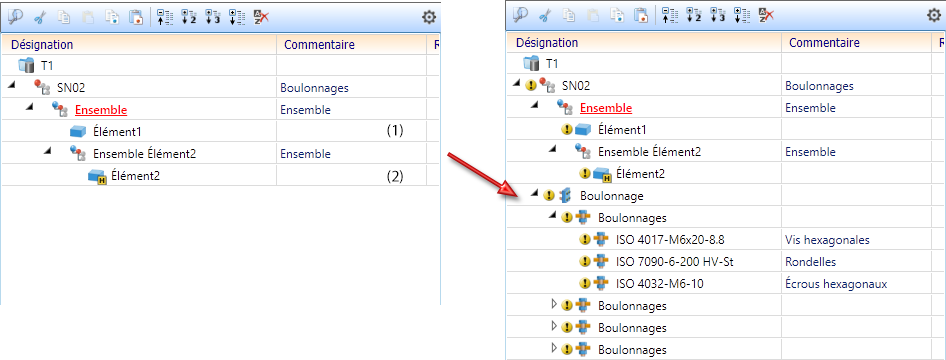 Si le premier élément choisi appartient à un ensemble, alors de la même façon sera répertorié l'ensemble RACCORD VISSÉ dans l'ensemble du premier élément. Si par contre ce premier élément n'appartient à aucun ensembles, l'ensemble RACCORD VISSÉ sera introduit au plus haut niveau de la structure d'élément.