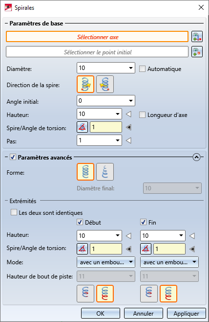 , vous pouvez accéder à la partie basse de la fenêtre (par défaut, cet encart est fermé). Vous y avez la possibilité, en cochant la case Paramètres avancés, de définir d'autres paramètres. À titre d'exemple, vous pouvez choisir entre une forme de spirale cylindrique ou conique et spécifier un tracé différent au début et à la fin de la spirale.
