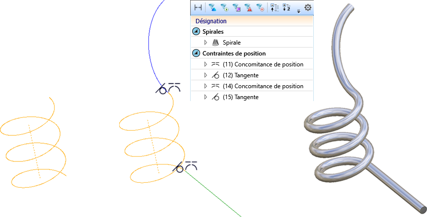 Les spirales peuvent également être utilisées comme lignes directrices pour la fonction Sweep de chaîne d'arêtes. Cela est également une possibilité alors que d'autres éléments d'esquisse auraient été insérés au début ou à la fin de la spirale. Dans ce cas, ces éléments auxiliaires doivent être alors reliés par une contrainte de concomitance de position avec le début/la fin de la spirale !