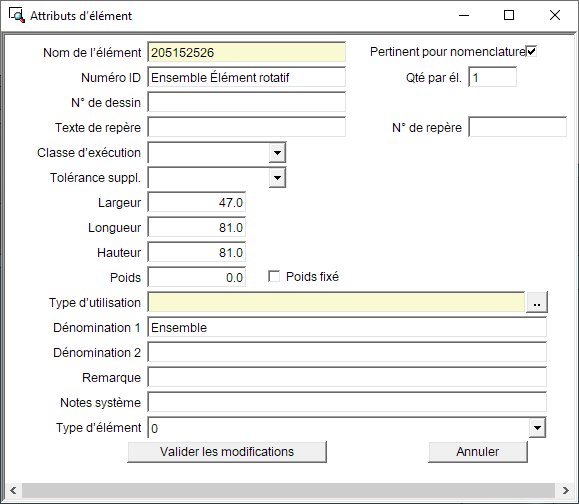 Pertinent pour nomenclature. - Appliquez les données saisies en cliquant sur le bouton Valider les modifications ou en appuyant sur la touche ENTRÉE (Retour). Au moyen de la touche ECHAP ou du bouton Annuler, vous pouvez mettre fin à la fonction sans enregistrer les modifications.