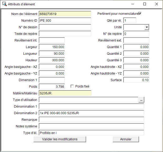 Le masque Attributs d'élément pour les profilés et les tôles de la construction en acier est différent de celui des autres éléments 3D. De plus, certains attributs d'éléments seront alloués automatiquement aux éléments de la construction en acier, notamment le Numéro ID, le numéro de repère (de position), la longueur, la largeur, la hauteur, le poids, le type d'élément, la pertinence pour nomenclature (oui), etc.