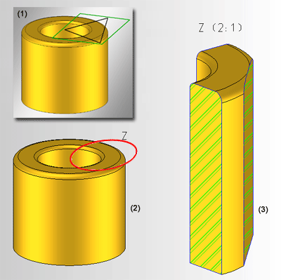 Lors de la création d'une vue de détail d'une vue en coupe ou en coupe partielle, l'état actuel de la vue en coupe ou de la vue en coupe partielle sera copié dans la vue de détail. Si la coupe ou la coupe partielle de la vue d'origine est modifiée par la suite, cela n'aura aucun effet sur la vue de détail. Cela signifie que la coupe ou la coupe partielle doit être modifiée séparément si nécessaire.