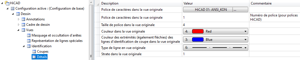 La représentation de l'identification de la vue de détail, ainsi que le type, la hauteur et la couleur de la police pour l'identification se réfèrent aux paramètres du Gestionnaire de Configuration sous Dessin > Vues > Identification > Détails. Vous pouvez y spécifier le type la hauteur et la couleur de la police, et la couleur et le type de ligne, et enfin la strate dans la vue d'origine.