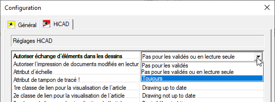 Dans la configuration de la BD (Options HELiOS > Base de données), vous pouvez sélectionner à l'onglet HiCAD quand l'échange des éléments sur les scènes sera possible, c'est-à-dire quand les éléments référencés dans les scènes verrouillées pourront être modifiés, actualisés et enregistrés.