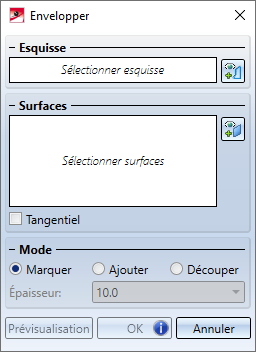 Cette fonction permet de créer une augmentation, une réduction et une impression de l'élément en "enveloppant" les surfaces de l'élément avec une esquisse. Les formes coniques et les tôles obtenues de plusieurs éléments sont également autorisées.