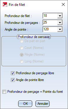 Si la case Profondeur de perçage libre est cochée, alors une autre case devient à son tour disponible : Profondeur de perçage = Point du foret. Lorsque cette dernière est cochée, cela signifie que la profondeur de perçage correspond à la pointe de la fin du filet.