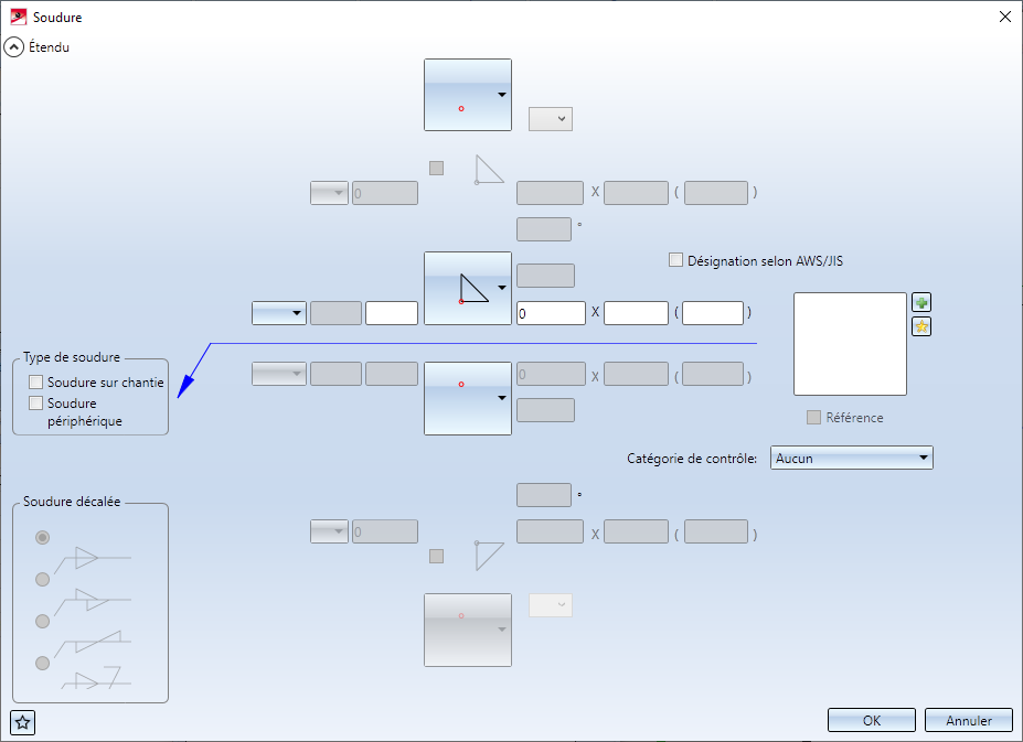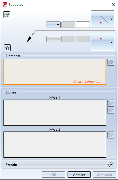 Cliquez sur le symbole Paramètres pour accéder aux paramètres avancés. Le fonctionnement de la fenêtre de dialogue s'affichant ensuite est très similaire à la fonction Insérer un symbole de soudure, à la différence qu'ici toutes les options ne sont pas disponibles.