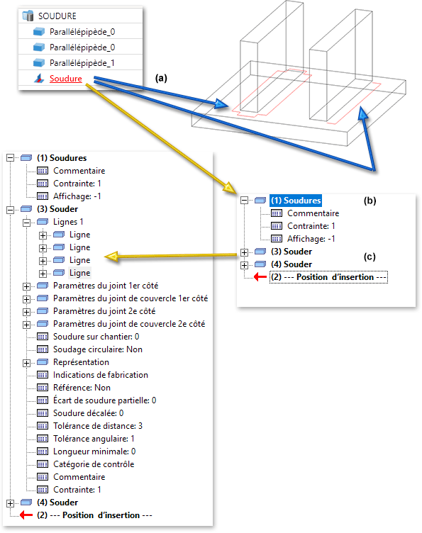 Dans l'exemple de l'illustration, les soudures (créées en une seule étape de travail) sont d'abord créées à gauche. À cet effet, l'élément principal Soudure (a) est généré. En activant ensuite l'élément principal de soudure, cela lance de nouveau la fonction de soudure et génère la soudure de droite. L'historique de Feature comporte alors le Feature de création (b), ainsi que deux Features de soudure (c). Dans l'exemple se trouve le Feature (3) pour les soudures créées en premier (d'où les quatre entrées dans Lignes).