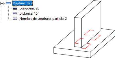 Dans la représentation en réduit (simplifiée), une ligne de la longueur indiquée est créée au début et à la fin de la soudure (pour les soudures discontinues alternées, par élément de soudure) ainsi qu'une connexion à ces deux lignes.