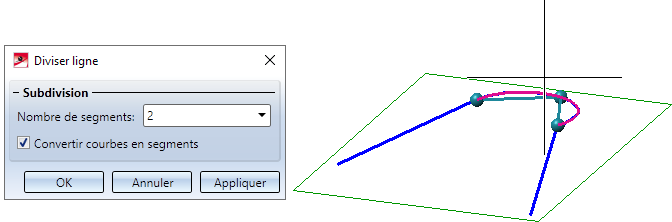 À l'aide de cette fonction, vous pouvez diviser les lignes d'une esquisse en saisissant le nombre de composants. Vous pouvez également spécifier si les composants ainsi obtenus devront être convertis en segments ou non.