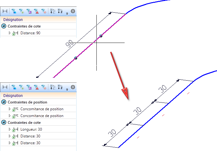 - Les contraintes HCM seront transmises à un des éléments auxiliaires obtenu par la division. Le point de cote est ici déterminant pour l'attribution.