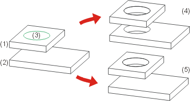 (1) Élément principal, (2) Élément secondaire, (3) Esquisse, (4) Perçage en prenant en compte les éléments secondaires, (5) Perçage sans prendre en compte les éléments secondaires