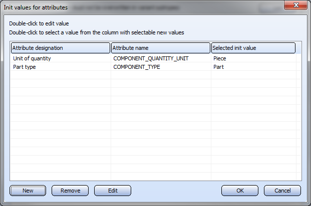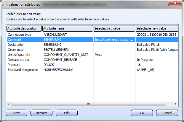 In the above example the part attributes assigned during the last input are listed. No predefined values have been selected for the other rows - the Selected init value column is empty. You can use the New, Remove and Edit buttons to specify predefined values. Or you can apply a value from the Selectable new value column by double-clicking it.