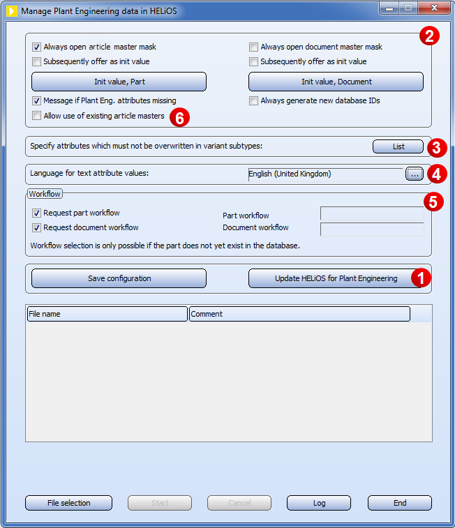 If no update is necessary, or if an update was successfully performed, the program DbPlantDataImport displays the Manage Plant Engineering data in HELiOS dialogue window. The following tasks can then be performed: