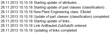 The actions performed with the DbPlantDataImport.exe program will be recorded in the log file DbPlantDataImport_Protocol.txt saved to the TEMP directory of your HiCAD installation. Click the Log button to view the contents of the file.