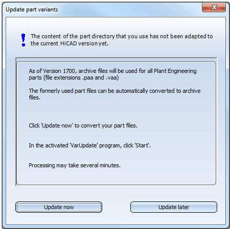 When you start HiCAD and the DBPlantDataImport tool, it is checked automatically whether an update of the variants will be necessary. If required, the updating will be performed automatically. You have the option to cancel the process, which will close the program. The program will also be closed if errors occur during updating of the variants.