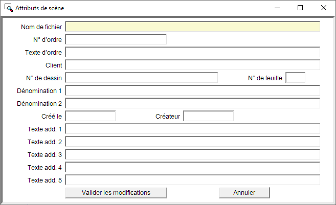 Certains de ces attributs seront affectés directement à la création de la scène ou à l'insertion d'éléments ou d'ensembles. D'autres pourront être complétés à l'aide des fonctions Attributs de scène et Attributs de l'élément (depuis le menu contextuel de la scène, respectivement de l'élément). Une fenêtre de dialogue Attributs de scène ou Attributs d'élément s'affiche alors. Le contenu de la fenêtre de dialogue dépend en fait de l'élément sélectionné (ex. Ensemble, Élément 3D, Tôle pliée, Profilé, Tuyauterie, etc.), ainsi que de la configuration des paramètres (Construction mécanique, Construction Acier/Métal, Construction d'installation, DSTV, BIM).