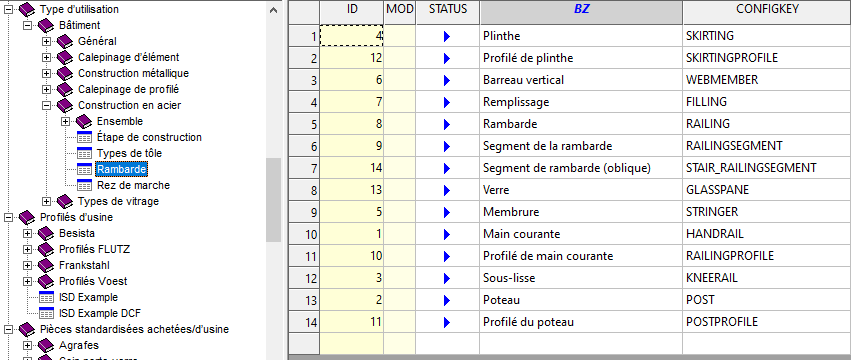 Si, par exemple, seul le réglage dépendant du type d'utilisation STRINGER doit être attribué aux mains courantes de type acier plat, vous devez alors sélectionner l'entrée Acier plat dans les types d'élément.