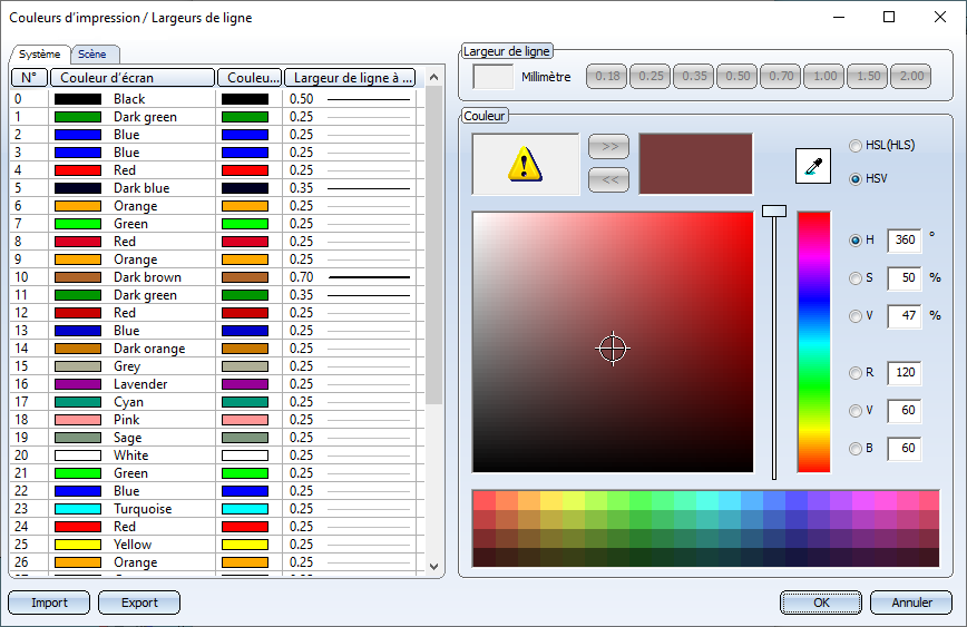 Vous pouvez ici attribuer une couleur d'impression et/ou une largeur de ligne particulière aux Couleurs du système et de la scène.