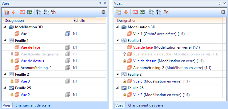 Changement indifférent entre les vues de modélisation (1) et de feuille (2)