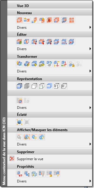 Pour modifier les vues / la structure des vues, la barre d'outils de la fenêtre des vues de l'ICN vous indique par les symboles suivants les différentes fonctions disponibles :