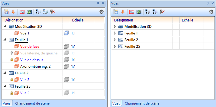 L'onglet Vues comprend la structure de vue de la scène actuelle. HiCAD différencie les vues de modélisation et de feuille.