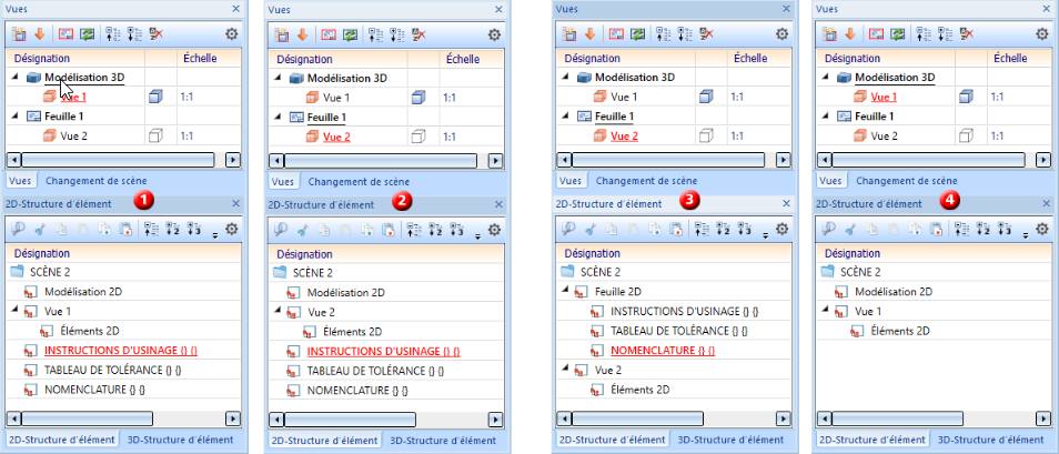 Ne seront listées que ces figures de vue 2D qui appartiennent à la feuille ou à la modélisation active.