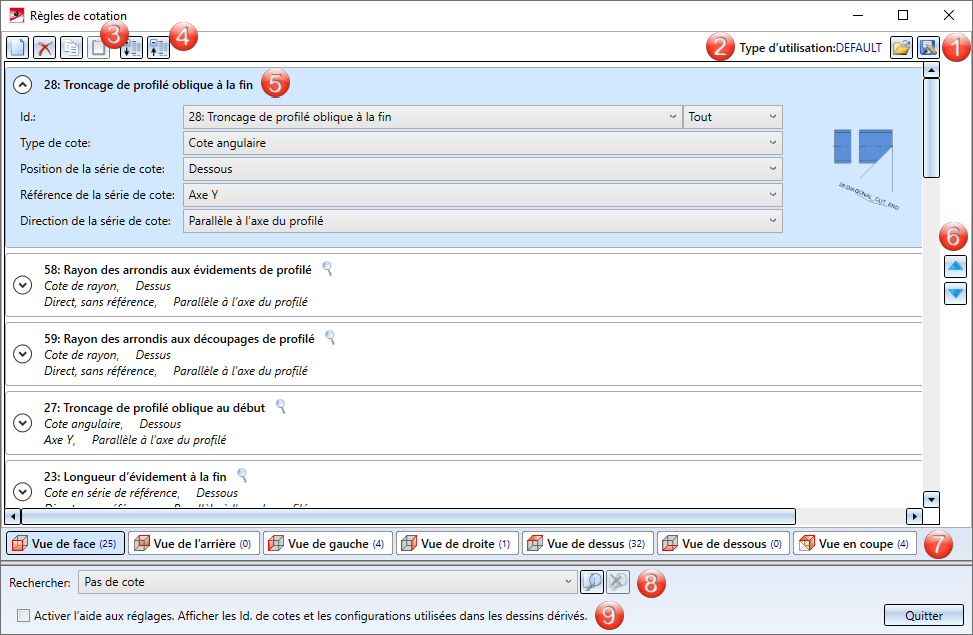 Pour modifier une règle de cotation, sélectionnez-la dans la vue correspondante en cliquant avec la souris. La règle active est surlignée en bleu et la vue étendue est automatiquement affichée.