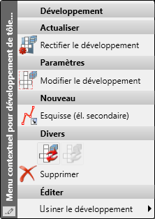 Vous avez la possibilité de spécifier les paramètres du développement au moment de le créer. Les fonctions permettant de modifier les paramètres se trouvent sous Tôle pliée > Développement de tôle > Menu déroulant Actu.