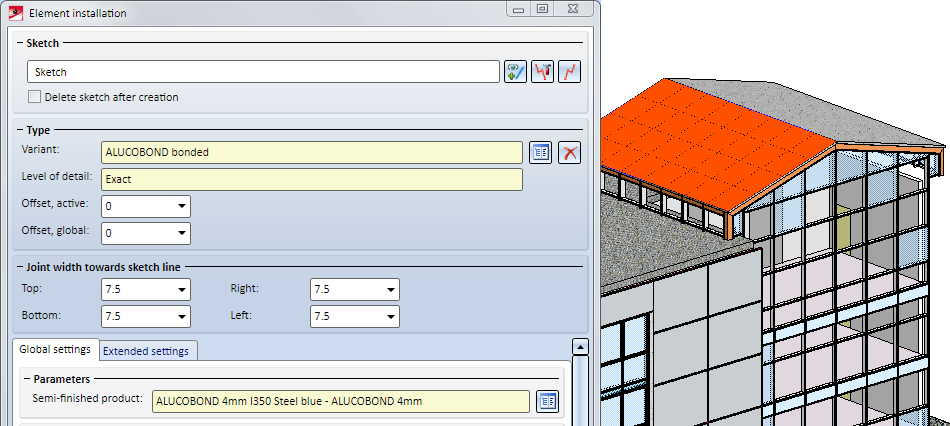 Finally, the elements for the roof will be installed. Open the Element installation dialogue window again and select Sketch (3). Since we want to place elements on all areas of this sketch, it will suffice to choose the installation element - here: ALUCOBOND bonded - and to reset the Offset to 0 again. Confirm and close the dialogue window with OK.