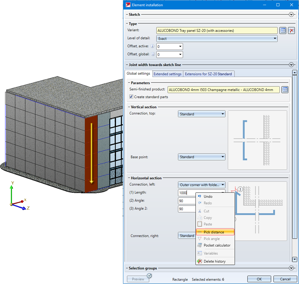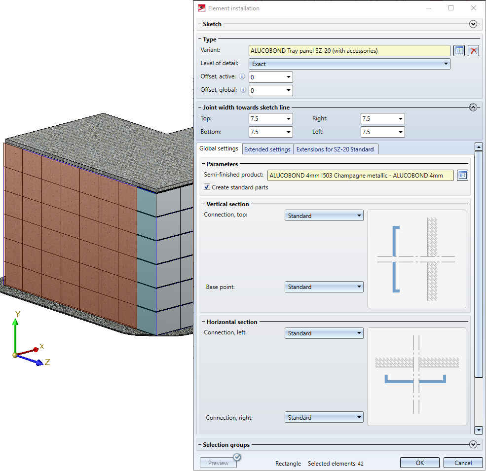 Here, too, choose an ALUCOBOND Tray panel SZ-20 and confirm the default settings with OK. A second assembly called Element installation will be created.