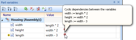 It may not occur that variables refer cyclically to themselves. Otherwise an error marking is indicated at the variables concerned and the values of the formulas are no longer updated. If you point with the mouse at an error marking, an explanation of the error and the affected variables is displayed: