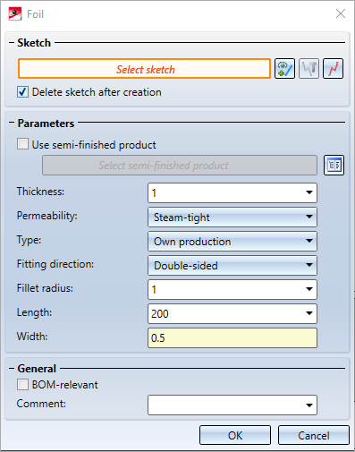 The function Foil, available in the Civil Engineering functions docking window at Civil Engineering, general > Civil Engineering - Sectional view (3-D) > Foil, has been revised. It is now possible to select or create a sketch directly from the dialogue. Foils can be taken as semi-finished products from the catalogue and the effects of the individual settings are visualized as a real-time preview directly in the model drawing.