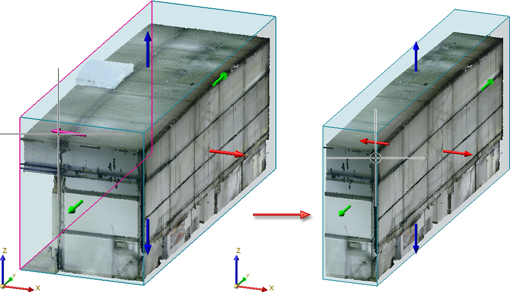 Since point clouds are usually very large, they can only be used sensibly if so-called clipping boxes are defined for the different areas of a point cloud. By defining so-called clipping boxes, unneeded parts of the point cloud can be temporarily cut away, so that the remaining area of the point cloud can be better measured or edited. For example, only the back wall or the floor of a building can be displayed and edited.