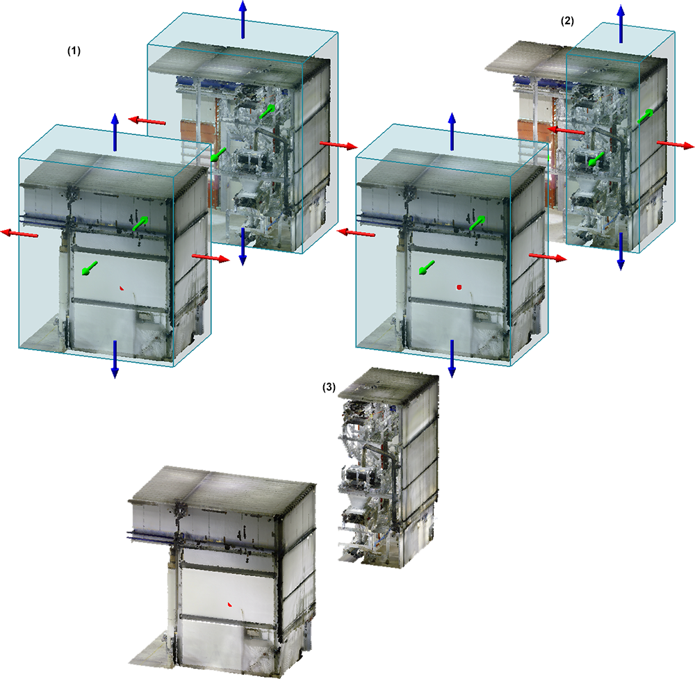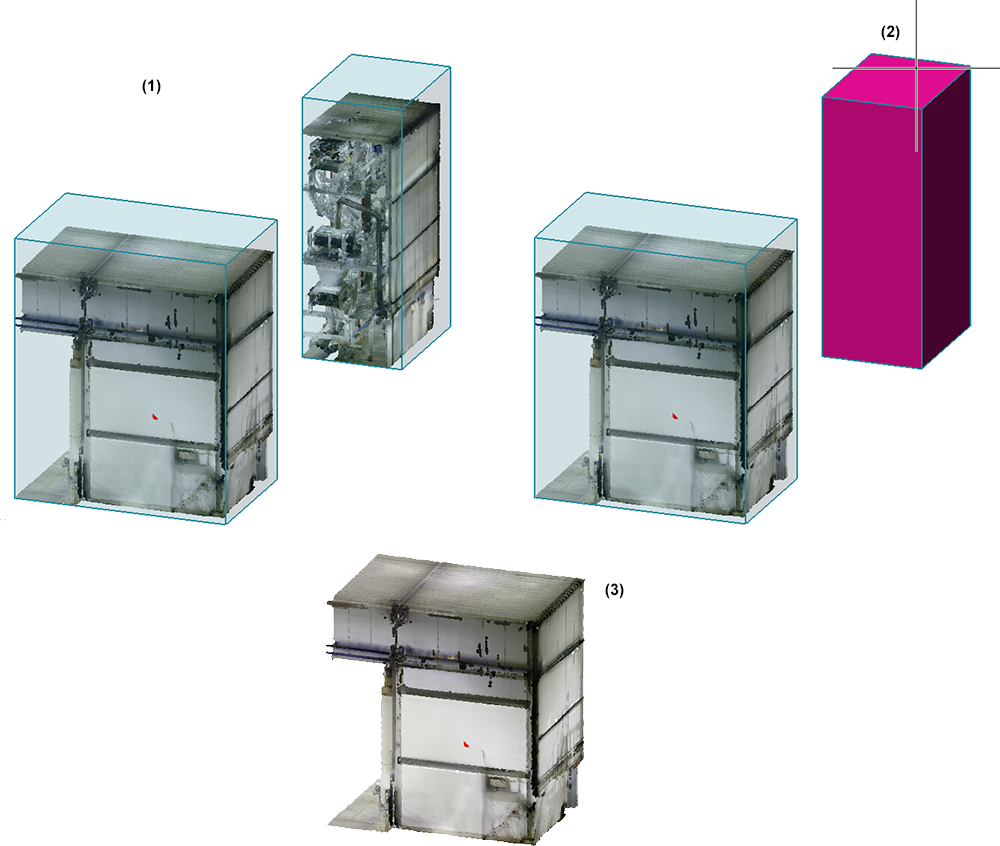 (1) Original point cloud, (2) Point cloud trimmed by two clipping boxes, (3) Point cloud after toggling the clippings