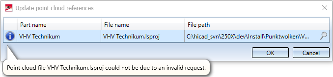 If HiCAD does not find a point cloud contained in a model drawing when loading it, the Update point cloud references dialogue window is automatically displayed. If you move the cursor over the