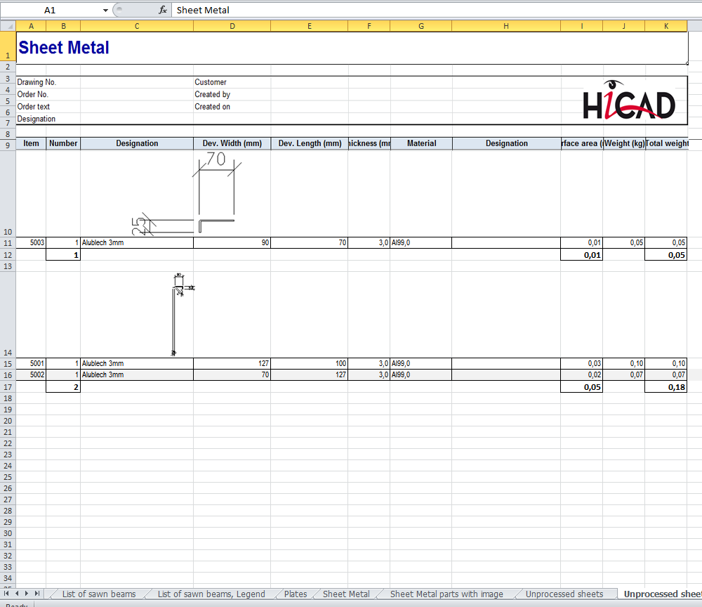 In this case an additional spreadsheets for unprocessed sheets will be added in the Excel BOM: