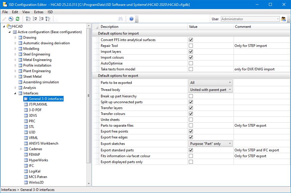 In the ISD Configuration Management under Interfaces, you can define which default settings are to apply to the import and export of the general 3-D interfaces such as Step, IGES, DXF/DWG, etc. These settings are then displayed as default in the respective import/export dialogue when called up in HiCAD.