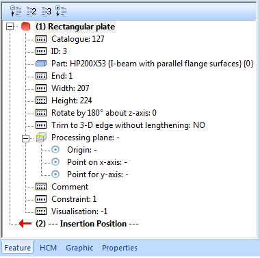 Feature Technology is active during designing in Steel Engineering, i.e. the construction step is recorded as a feature log in many cases. During construction, the state of this feature log has no influence on the dialogue or the construction process with HiCAD.