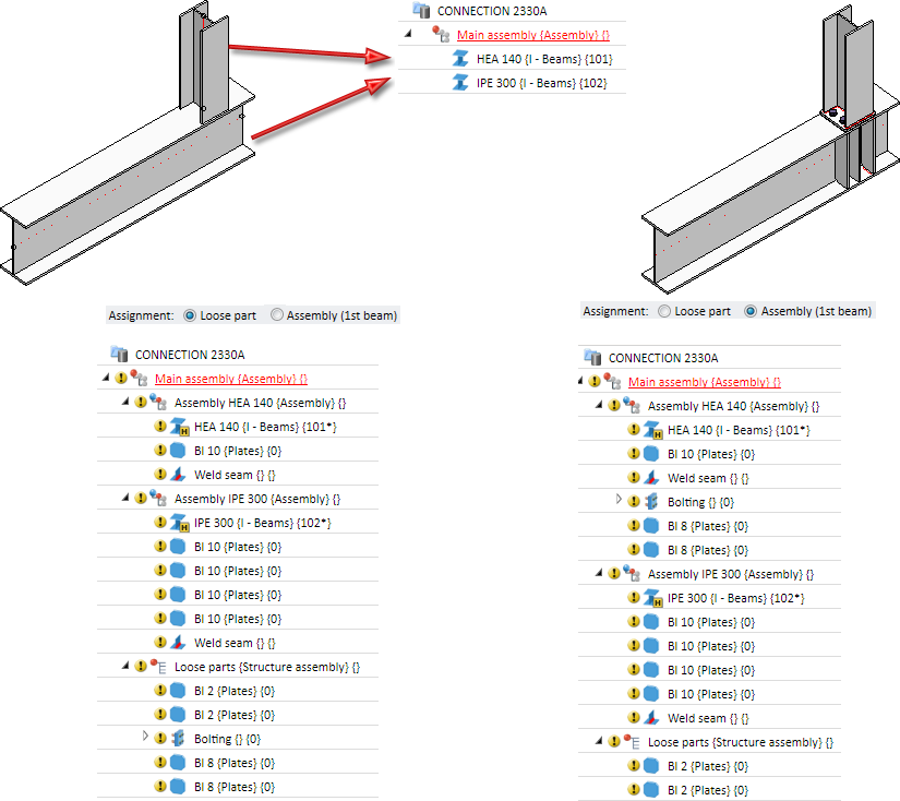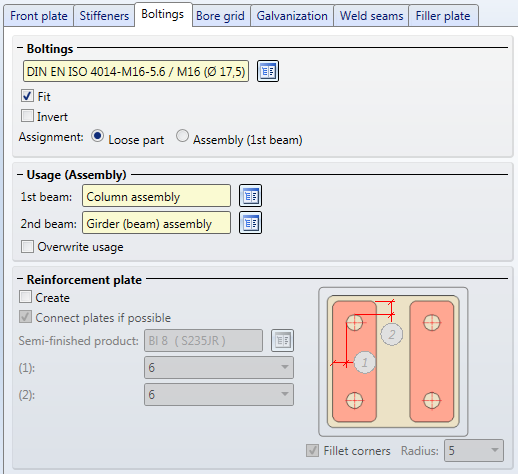 If the Assembly 1st beam option is active, the boltings and the reinforcement plates will be assigned to the assembly of the 1st beam.